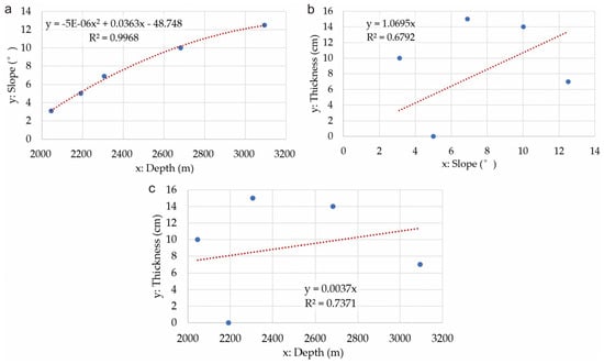 Additionally, a slight positive correlation is observed between crusts thickness and both slope and depth (R2 values are 0.6792 and 0.7371, respectively), with the following linear equations (Figure 9b,c):