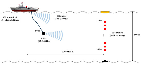 Acoustic data collected from the SAVEX15 experiment, which was conducted approximately 100 km south of Jeju Island, Korea, were widely used in previous RBD-related research and were utilized in this study. The water depth at the experiment site was approximately 100 m, and two VLAs, each consisted of 16 elements, were deployed to span half of the water column from 25 to 81 m. Figure 2 illustrates the experimental layout for the segment of the experiment in which the acoustic data analyzed in this study were collected. At 04:11 UTC on 26 May, the R/V Onnuri approached one of the two moored VLAs to a distance of approximately 220 m and then moved away to a distance of approximately 3800 m by 05:01 UTC. During this movement, the R/V Onnuri simultaneously towed two acoustic sources, the ITC-2040X and ITC-1001, which emitted acoustic waves at frequencies of 3–10 kHz and 12–26 kHz, respectively, at a depth of approximately 50 m, while maintaining a nearly constant speed of approximately 1.5 m/s. Continuous wave and LFM signals with varying pulse lengths and bandwidths were transmitted by omnidirectional transducers. To evaluate the proposed method across both high- and low-frequency bands, the high-frequency LFM signals (12–26 kHz), transmitted every 4 min with a 60 ms duration, were analyzed, along with the ship noise data (200–2700 Hz), which represented a lower-frequency band than the towed source.