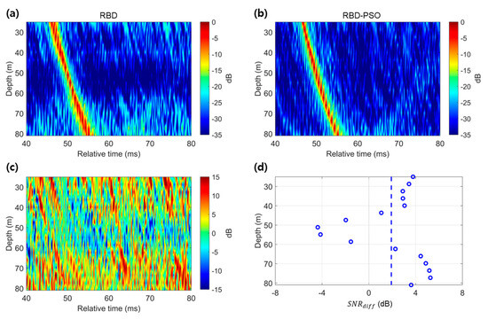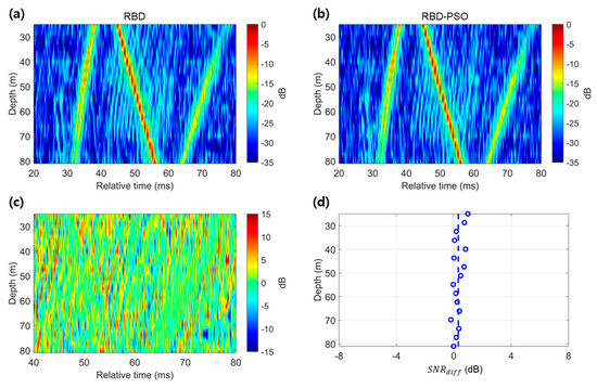 Figure 4 presents and , their difference (), and at a distance of 900 m. Three distinct arrival paths were identified (Figure 4a,b). In contrast to the results at 240 m, where a single arrival path was estimated, at 900 m, the first arrival path was observed from the element positioned closest to the seabed. Eigenray analysis (Figure A2) confirmed that the first arrival path, which appeared as a single path, resulted from the near-simultaneous arrival of the bottom-reflected path (B-path) and the surface–bottom-reflected path (SB-path), which arrived within approximately 0.4 ms of each other at the first element from the sea surface. As the distance increased from 240 m to 900 m, the predicted arrival time difference between the direct and surface-reflected paths decreased from 0.2 ms to 0.001 ms, and thus, became sufficiently small to cause superposition. This superposition led to destructive interference, which prevented these paths from being observed. This prediction was consistent with the CIRs estimated using both RBD and RBD-PSO. In the estimated CIRs, the second arrival path appeared as a single arrival with the strongest intensity, which resulted from the consecutive arrivals of the bottom–surface-reflected path (BS-path) and the surface–bottom–surface-reflected path (SBS-path). The third estimated arrival path was identified as two closely spaced subsequent paths. Each arrival path was found to form a pair, where the second arrival path exhibited the highest intensity due to the coherent summation of the paired paths (Figure A2e). Figure 4c,d show the results obtained using the same method as in Figure 3 to evaluate the performance improvement of the proposed method at 900 m. In Figure 4c, which depicts , the arrival paths in the CIRs were significantly reduced. However, no reduction in the noise level was observed, regardless of the receiver depth. Figure 4d depicts the time-averaged across all 16 elements, which yielded a depth-averaged value of 0.3 dB. Consequently, no significant improvement in the CIR performance was observed at this distance.