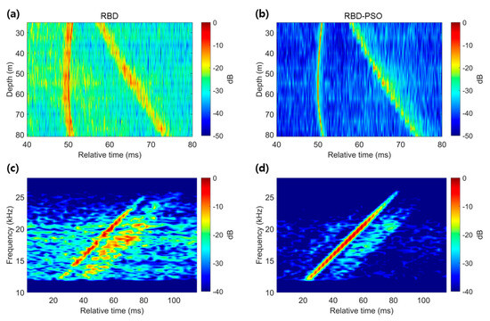 In the high-frequency band, an LFM signal emitted from a towed source at a depth of 50 m was analyzed at two distances: 255 m (26 May, 04:13 UTC) and 1280 m (26 May, 04:29 UTC). The source waveform was reconstructed through deconvolution of the received signal using the estimated CIRs. Cross-correlation coefficients with the known source waveform were calculated in the same manner in [22]. Since a higher cross-correlation coefficient indicates a greater accuracy in CIR estimation, this metric was used to evaluate the performance improvements. Figure 7 presents the estimated CIRs using RBD and RBD-PSO, along with the short-time Fourier transforms (STFTs) of the reconstructed source waveform at close range. The CIRs estimated using RBD-PSO exhibited arrival paths with shorter durations, sharper peaks, and a higher SNR compared with those obtained using RBD (direct path: ~50 ms; surface-reflected path: ~60–75 ms). The second row of Figure 7 presents the STFTs of the reconstructed source waveform, where the RBD-PSO method demonstrated a higher SNR and a smoother upsweep frequency pattern compared with the RBD estimation. Furthermore, the cross-correlation coefficient with the original source waveform increased significantly from 0.29 to 0.79.
