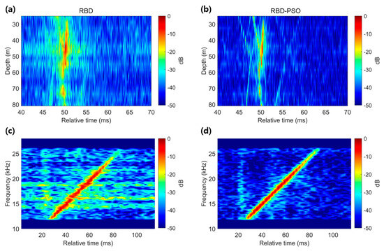 Normalized intensities of the CIRs estimated by (a) RBD and (b) RBD-PSO at a distance of approximately 1280 m between the R/V Onnuri and the VLA with an LFM signal (12–26 kHz). The second row shows the STFTs of the reconstructed source waveform using (c) RBD and (d) RBD-PSO.