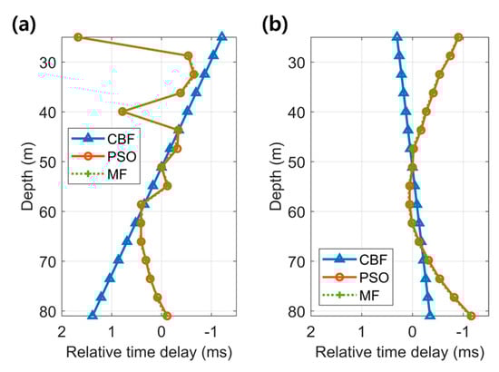 Figure 9 depicts the relative time delays for each element estimated using conventional beamforming, MF, and PSO at two distances. In Figure 9a, conventional beamforming assumed a plane wave, which resulted in relative time delays that appeared as a straight line. In contrast, the relative time delays estimated using PSO closely matched those obtained through MF, which could be considered the ground truth. Additionally, the acoustic wavefronts exhibited a curved shape caused by the direct path that arrived slightly later at both ends of the array due to spherical spreading. The relative time delays at a range of 1280 m are shown in Figure 9b. For the ship noise case, the relative time delays estimated using conventional beamforming and PSO were nearly identical, as the acoustic wavefront conformed to the plane-wave assumption at longer distances. However, for the LFM signal case, the relative time delays differed from those estimated using conventional beamforming, even at a sufficiently large distance, where the wavefront was expected to approximate a plane wave. This discrepancy arose because the ship-radiated noise was generated near the sea surface, whereas the LFM signal was emitted closer to the sound channel axis, where acoustic wave refraction was more pronounced (Figure A3). Furthermore, RBD-PSO accurately estimated the time delay corresponding to the direction of strong arrival paths, which are identified refracted direct paths (Figure A3d). Additionally, the relative time delays estimated using PSO were nearly identical to the MF results, even at long distances.
