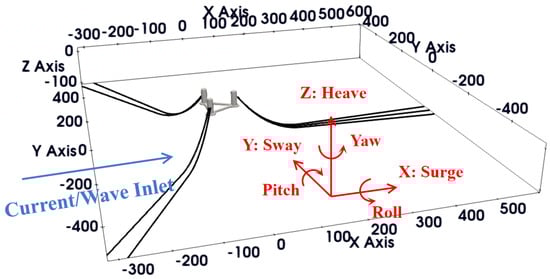 In this study, the turbine’s dynamic behavior is simulated for both extreme and normal cases. The test-condition parameters are summarized in Table 2. This FOWT will be deployed in the offshore regions east of Hainan Province, China. A metocean study was conducted to determine the wave and current conditions. Due to confidentiality concerns, the details of the metocean study are not provided here. The normal case has a regular wave height of 2.0 m and current speed of 1 m/s, which can be considered as strong current plus weak wave. The extreme case has a regular wave height of 12.0 m and a current speed of 2.0 m/s, which represents strong waves plus weak current. In our simulations, only regular waves are currently considered for simplicity. To better illustrate the WCI effects on the platform’s motion, numerical simulations are performed for wave-only, current-only, and wave–current cases. In this study, the aerodynamic load on the blades is not included, as the focus is primarily on the hydrodynamic and structural responses to wave and current forces.