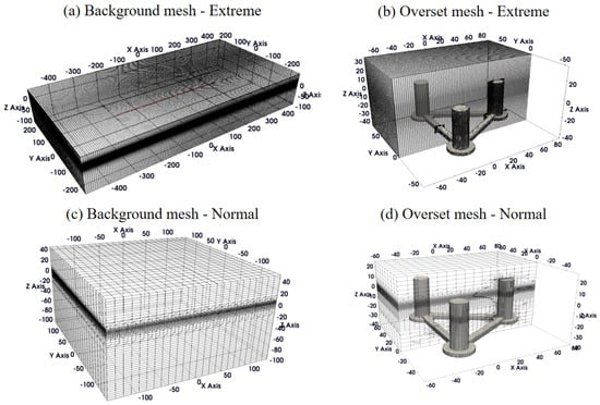 Due to the differences in wavelength and wave height between extreme and normal cases, different computation domain sizes and grid sizes are required, resulting in the use of two meshes for the simulations under each condition. The computational domain is depicted in Figure 2. To account for the large movement of the platform, an overset mesh technique is employed to simulate the fluid–structure interaction, thereby enhancing the stability of the simulations. The background mesh is shown in Figure 2a,c, while the overset mesh is presented in Figure 2b,d. The boundary conditions are specified as follows. A zero-gradient pressure condition is applied at both the inlet and outlet boundaries. The inlet fluid velocity is determined by the wave and current speed, while the outlet boundary is applied at active wave absorption boundary. A non-slip wall boundary condition is applied at the bottom and floater. The initial conditions are set based on the prescribed current velocity profile. The total number of cells in the simulation ranges from approximately 1.50 million to 3.50 million for both extreme and normal cases. To accurately resolve the wave dynamics, the vertical grid resolution within a region spanning three times the wave height above and below the still water level is maintained between 1/20 and 1/10 of the wave height. The horizontal grid resolution varies between 1/100 and 1/20 of the wavelength, with a gradual refinement strategy applied from the domain boundaries toward the floating platform. Additional localized mesh refinement is implemented near the platform to enhance accuracy in the fluid–structure interaction region. The grid convergence study is presented in Appendix A. The simulations were performed in parallel using 30 cores for each case on the HPC system of Tsinghua University, China. The average simulation time for a 300-s run is between 7 and 10 days, though this may vary depending on the specific case.