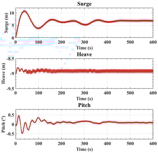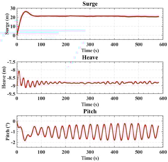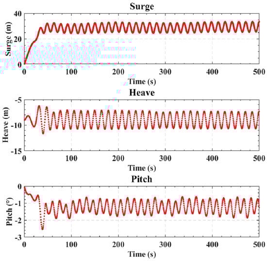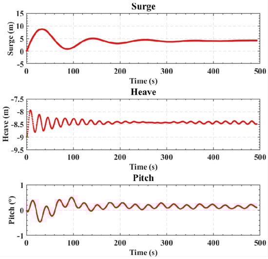 Due to the symmetry of the proposed numerical simulation, there is little sway, yaw, and roll of the platform, so the motion responses of the platform under extreme wave-only cases were evaluated for surge, heave, and pitch. The time-series results are provided in Figure 3. When subjected to extreme wave forces, the platform exhibits a surge with an approximately 24 m mean value (moves to the downstream), and an oscillation amplitude of 8 m. The heave motion has an amplitude of about 3 m, and the mean value is around m, which is the original vertical position of the CoG. The pitch is around 0.8° (tilting backward), with a motion amplitude of 1°. To further investigate the motion characteristics, a Fast Fourier Transform (FFT) analysis was conducted on the last 150 s of the time series, as summarized in Table 3. The analysis indicates that the dominant frequencies of the surge, heave, and pitch motions align with the wave frequency (0.068 Hz) under extreme cases, so waves, as expected, control the time-varying motion of the platform.