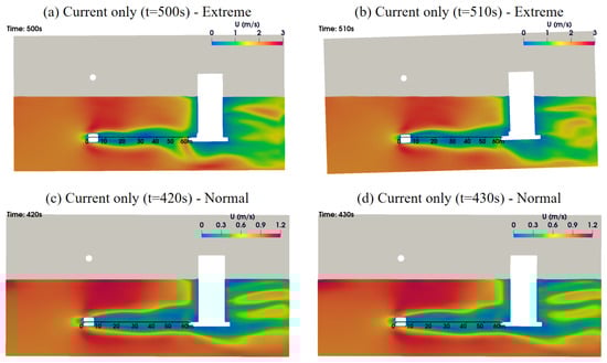 Spanwise cut of simulated flow fields in current-only case: (a) t = 500 s in extreme case, (b) t = 510 s in extreme case, (c) t = 420 s in normal case, and (d) t = 430 s in normal case.