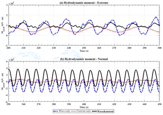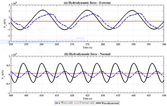 We extracted the hydrodynamic forces on the platform under three different cases in extreme and normal conditions: wave-only, current-only, and wave–current interaction. The purpose of this analysis is to investigate the correlations and differences between platform loads under these cases, as well as the relationship between platform loads and motion.