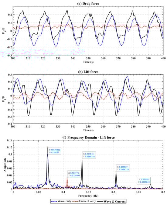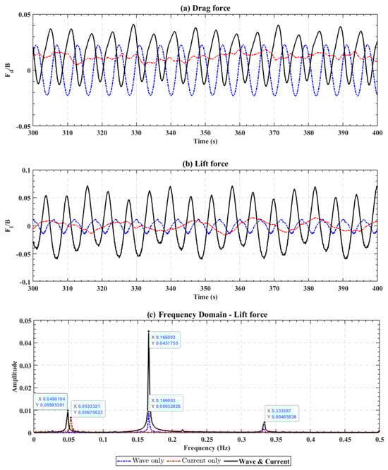The WCI effects on lift force the the normal case are different from those under the extreme case. As shown in Figure 16b, the lift force in the wave–current case exhibits significantly greater time variation compared to the wave-only or current-only cases. The spectral analysis reveals more details. The primary peak of the lift force spectrum, which is at the wave frequency, is greatly enhanced by the current. Also, the higher-order harmonics (e.g., at 0.334 Hz or twice the wave frequency) are also enlarged. This suggests that the interaction between the wave-induced and the current-induced vortex shedding introduces additional frequency components, amplifying the oscillations in the lift force. In contrast to the extreme-condition simulations, the local peak around the vortex shedding frequency (around 0.05 Hz) is present in both the current-only and wave–current cases. This suggests that the wave does not eliminate vortex shedding caused by the current under strong-current, weak-wave cases.