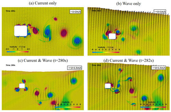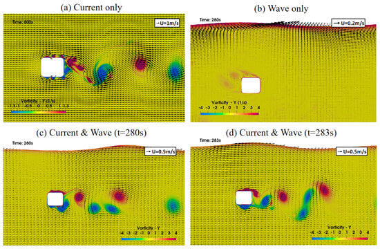 Simulated flow fields under the normal case: (a) current-only case, (b) wave-only case, (c) wave–current case at t = 280 s, and (d)normal wave–current case at t = 283 s.