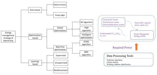 However, due to the differing operating characteristics and electricity generation methods of respective energy systems, a hybrid system that integrates new energy systems with traditional diesel engine systems is inherently more complex. Therefore, efficient cooperation between traditional diesel engine systems and new energy systems is essential [4]. The ship’s energy management strategy functions as the brain of its power system. Its role is to optimize the processes of power generation, distribution, and consumption; to intelligently control the power system; to optimize the working conditions of the ship’s power system components while meeting power demands; and to enhance the ship’s fuel economy [5].