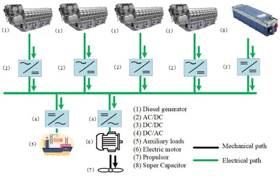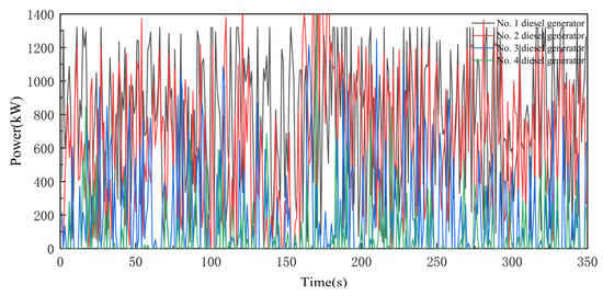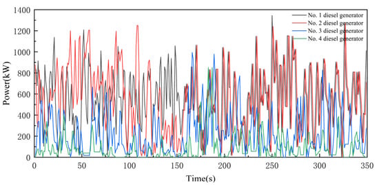 To simulate the working state of the ship’s power system under actual working conditions, to ensure that the ship’s power system operates reliably and safely, and to simplify the simulation process, four diesel generator sets and a supercapacitor system were simultaneously run in the network to validate the method; the equipment jointly supplied the ship with power. By considering the structure of a hybrid power system, a full ship power balance model was obtained.