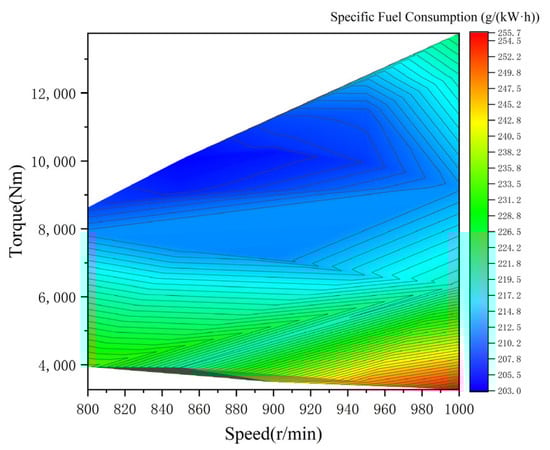 where is the specific fuel consumption, g/(kW·h); is the speed of diesel engine, r/min; and is the torque of the diesel engine, Nm.