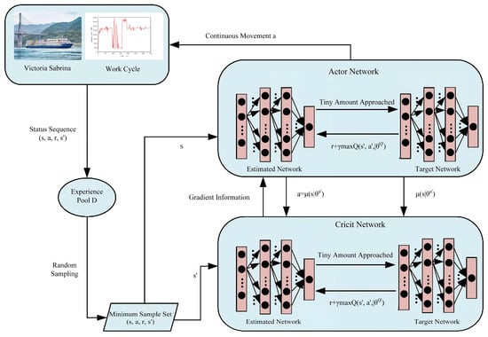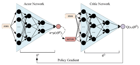 The DDPG algorithm is based on the actor–critic (AC) network framework (Figure 7). It incorporates the previously presented deterministic PG algorithm into the AC network framework.