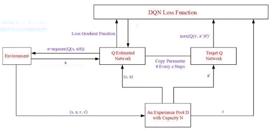 The deep neural network in the DQN algorithm is a supervised learning model. Thus, it is generally required that the front and back samples of the input neural network are independent and identically distributed. However, the front and back states of the reinforcement learning problem have evident probability relations. To eliminate the correlation among the input states, experience replay and parameter freezing are added to the DQN algorithm [31]. The resulting working mechanism is shown in Figure 9.