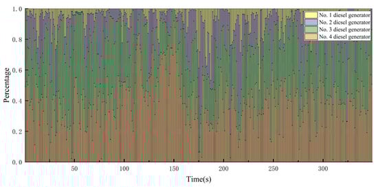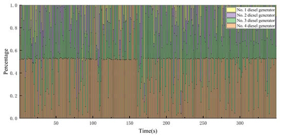 Figure 13 shows the output power curves of the four diesel generators under whole navigation conditions. The output power of the diesel generators fluctuates frequently owing to the frequent charging and discharging of the supercapacitors under sailing conditions and the large power fluctuations. The entire ship’s energy demand is provided by the diesel generator set. Thus, it must balance the charging and discharging power of the supercapacitor. However, the calculated reward function is “low” throughout the dynamic process, which effectively reduces the fuel consumption of the diesel generator set. Quantitatively, the standard deviation of generator power under DDPG is 32% lower than that of the DQN-based strategy, indicating smoother load transitions. This stability stems from the DDPG algorithm’s continuous action space, which enables fine-grained power adjustments compared to DQN’s discrete steps. Consequently, the supercapacitor’s SOC remains within the optimal range (0.48–0.6), avoiding abrupt charging/discharging events that degrade fuel efficiency. Figure 14 further quantifies the load distribution among generators. Generator 1 bears 28% of the total load on average, while Generators 2–4 contribute 24%, 23%, and 25%, respectively. This balanced allocation contrasts sharply with the DQN strategy, where Generator 1 disproportionately handles 34% of the load due to discrete action limitations. The DDPG algorithm’s ability to coordinate multiple generators reduces individual component stress, prolonging operational lifespan.