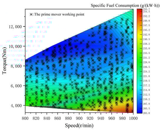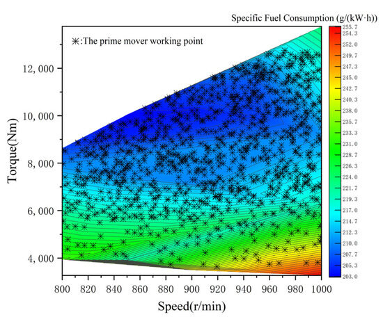 To further investigate the operating state of the prime mover of the hybrid marine diesel generator set under the energy management strategy based on the DQN algorithm, the operating points of the prime mover from the previously presented simulation experiments were plotted (Figure 21). The operating points of the diesel engine are mostly distributed in the upper region of the cloud [in the 203 to 211 g/(kW-h) specific fuel consumption range]. Some operating points are distributed in the high specific fuel consumption range [225 to 248 g/(kW-h)]. According to Equations (1) and (4), the average specific fuel consumption is 219.37 g/(kW-h), and the total consumed fuel amount is 50.35 kg for the entire trip.