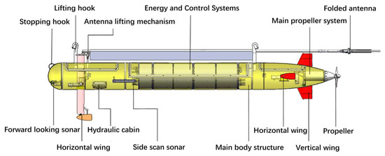 The vehicle’s main structure integrates carbon fiber-reinforced composite materials and syntactic foam, forming an integrated composite structure. Rib plates are used to enhance the overall strength and rigidity of the hull, while high-strength buoyancy materials are bonded and encapsulated within the carbon fiber shell to form a unified structure, thereby further increasing its strength and rigidity. Based on this structural foundation, the energy system, propulsion system, control system, navigation and positioning system, communication system, and mission payload units are deployed. The comprehensive structural arrangement of the SSOP is depicted in Figure 1, and its overarching framework is illustrated in Figure 2.