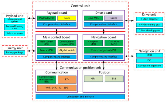 The system of the SSOP described in this paper is shown in Figure 3. It is centered around a central processing unit and divided into three subsystems: the main control subsystem, the propulsion drive subsystem, and the payload control subsystem. The main control subsystem consists of the core main control unit, sensor unit, and communication and processing unit. These three units are integrated onto a single circuit board, which not only decomposes functions to reduce the processing load on the central processor but also achieves high integration, reducing the cabling between hardware components and thereby enhancing overall system stability.