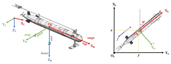 For the SSOP AUV, the kinematics of the robot is defined relative to two coordinates, namely the inertial coordinate system (OI-XIYIZI) and the body coordinate system (OB-XBYBZB) [27]. The inertial coordinate system is a fixed Earth-referenced frame, typically defined using the North–East–Down (NED) convention, while the body coordinate system moves with the vehicle and is attached to its center of mass or buoyancy. The vehicle’s motion is described in six degrees of freedom (6 DOF), consisting of translational motion (position and velocity) and rotational motion (roll, pitch, and yaw), which define its orientation relative to the inertial frame. The transformation between these coordinate systems is handled through rotation matrices or quaternions, accounting for environmental disturbances such as currents and waves.