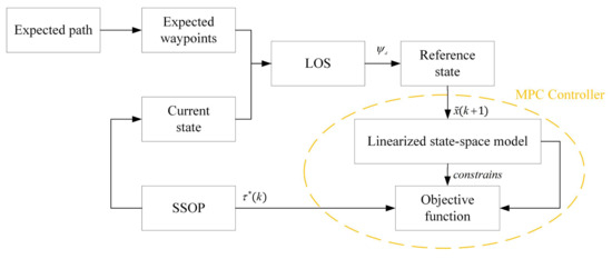 The system controller for path following is depicted in Figure 5. The controller consists of the LOS and the MPC controller. The LOS part calculates the expected heading angle according to the predicted trajectory point in real time. The MPC controller tracks the anticipated heading angle provided by LOS. Additionally, throughout this procedure, the practical limitations can be replicated in actual applications. The linearized predictive framework derived from state-space representation, the objective function, as well as the control strategies, must be formulated to develop the MPC controller. The subsequent subsections will provide specific designs for LOS and MPC controllers.