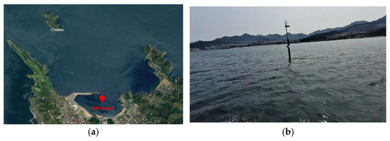Experimental scene. (a) Location of the experimental sea area; (b) Antenna above water during sea trial.