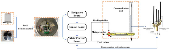 To identify the dynamic model parameters of the SSOP, it is necessary to first obtain the state information of the submersible. To this end, an inertial navigation system (INS) and a DVL are installed on the SSOP to collect relevant data. In Figure 9, the data collected by the sensors are transmitted to the main control compartment via serial communication. The navigation board in the main control compartment parses and packages the data before sending it to the sensor board. The sensor board then fuses the received data with other information, repackages it, and sends it to the main control board. Subsequently, the primary control module transmits the state information of the SSOP to the ground station via the 4G antenna of the communication and positioning system. At the same time, commands from the ground station are transmitted to the central controller via the 4G link. The central controller adjusts the PWM signals to effectively control the main thruster and rudders.