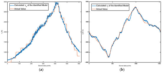 We analyzed and compared the fitting results of the aforementioned models with the actual values in Figure 10. Firstly, the pre-acquired data were substituted into the left-hand side of Equation (8) to calculate the model-predicted thrust and torque. Then, the calculated values were compared with the actual values. Figure 10a shows the comparison results between the calculated and actual values of thrust, whereas Figure 10b shows the analogous data between the calculated and actual values of torque. As observed in Figure 10, the identified model fits the actual values very well.