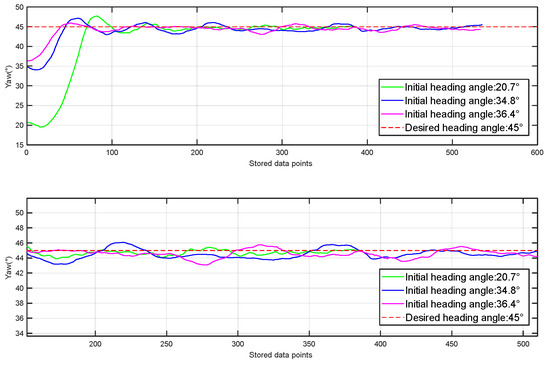 To assess the actual heading performance of the SSOP, heading tests are carried out in a marine environment with a wind force of 4 and a wave height of 0.8 m. Since the initial heading of the SSOP is unknown in practical applications, we specifically simulated scenarios where the initial heading angle was significantly different from the desired heading angle. In the tests, the initial headings of the SSOP were 20.7°, 34.8°, and 36.4°, respectively, while the desired heading was 45°. Figure 11 shows the heading results of the SSOP, with the lower graph illustrating the heading convergence. The experimental results indicate that the final heading accuracy error was 2°. Despite the large deviation of the initial heading from the desired heading angle, the SSOP was able to quickly adjust its yaw angle and eventually stabilize at the desired heading. This demonstrates that the proposed MPC controller exhibits fast convergence and tracking performance.