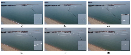 The snapshot of the SSOP in the “8” path following experiment. (a) t = 128 s. (b) t = 251 s. (c) t = 416 s. (d) t = 536 s. (e) t = 636 s. (f) t = 688 s.