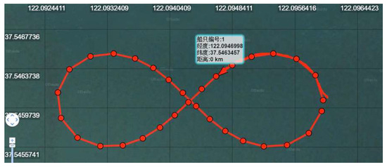Figure 12 shows a photo of the SSOP navigating along the “figure-eight” trajectory during the offshore sea trial. The trajectory tracking diagram of the SSOP’s upper computer is shown in Figure 13, where the red dots represent 32 preset trajectory points that constitute the predicted trajectory. The SSOP achieves trajectory tracking by following these points sequentially. Determined by whether the separation between the current position and the target position is less than three times the SSOP’s length, the control system can make real-time judgments on whether to switch to the next desired point.