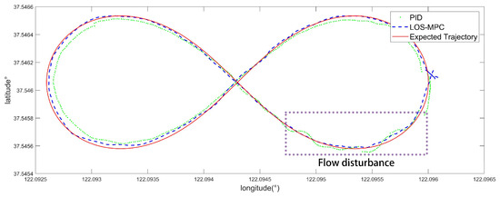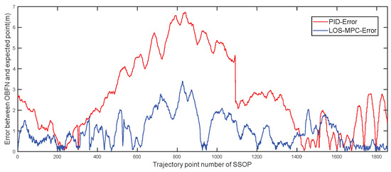 To demonstrate the superiority of the proposed LOS-MPC algorithm, this paper conducted comparative experiments with the traditional PID algorithm. Both algorithms were tested with the same desired trajectory, and to verify their disturbance rejection capabilities, comparative tests were also performed under adverse sea conditions. On the day of the sea trial, the sea conditions were characterized by a wind force of 4 and wave heights of 1 m. The comparative findings are illustrated in Figure 14. The LOS-MPC algorithm outperforms the PID algorithm in stability, reliability, and resistance to water currents. MPC’s model-based optimization dynamically adjusts control actions, counteracting flow disturbances more effectively than the fixed-gain PID controller. In contrast, PID often exhibits severe oscillations when facing currents due to overcompensation. By proactively optimizing control inputs, MPC ensures smoother and more stable trajectory tracking. Figure 15 illustrates the tracking errors of the two algorithms. The results indicate that even under time-varying sea conditions, the LOS-MPC algorithm can still maintain the effectiveness of path tracking, keeping the error between the SSOP and the desired point within 3 m.