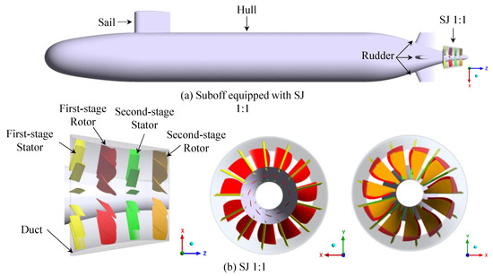 The subject of this study is a fully appended suboff standard model and its corresponding dual-stage PJP, which is independently designed, as shown in Figure 1. The suboff model has been widely used in numerous studies, with a hull length Lsub of 4.356 m, a hull diameter Dsub of 0.508 m, and complete appendages, including a sail and four rudders. The dual-stage PJP consists of five components: a first-stage stator, a first-stage rotor, a second-stage stator, a second-stage rotor, and a duct. The initial model is named SJ 1:1 because both rotors share the same load distribution ratio. All cases in this study were conducted at a design speed of V = 18 knots (9.259 m/s).