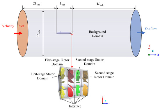 The vehicle studied in this paper needed to advance in open water, necessitating a large computational domain. As shown in Figure 2, the computational domain was divided into three stationary domains (one background domain and two stator domains) and two rotating domains (two rotor domains). Data transfer between these domains was achieved through interfaces. The inlet and outlet of the background domain were located 2 Lsub upstream of the bow and 4 Lsub downstream of the stern, respectively. The cross-section was circular with a diameter of 3 Lsub.