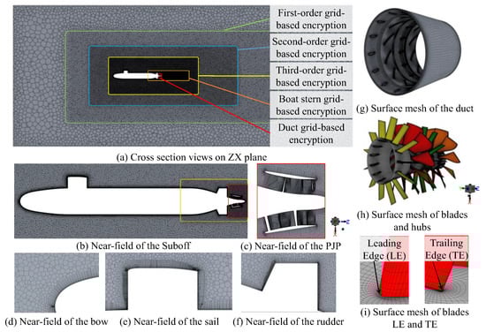 Regarding boundary conditions, the inlet boundary and background domain wall were both set to velocity inlet conditions, with the velocity magnitude matching the design speed but in the opposite direction. As the rotors operated under deep-sea conditions, cavitation was not considered in this study. Therefore, the outlet boundary was set as a pressure outlet with a reference pressure of 1 for the atmosphere. All the walls of the suboff and dual-stage PJP were set to no-slip conditions. The rotational speed of the rotor hub surfaces was set to 0 rpm, which is consistent with the actual conditions.