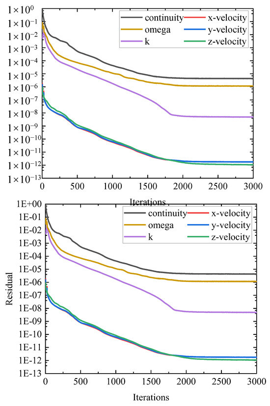 The finite volume commercial code ANSYS FLUENT 2024 R1 was utilized to solve the continuity, momentum, and turbulence equations. The numerical simulation in this study was divided into steady-state and transient calculations. The steady-state calculation was used for the rapid assessment of the hydrodynamic performance of the dual-stage propulsor and provided initial values for the transient calculation. The convergence of the steady-state calculation was determined primarily by velocity and residuals, achieving a steady state with residuals less than 10−4 after 3000 iterations. The decay process of the residuals is shown in Figure 4. The rotor domains were rotating domains, while the other domains were stationary, with the rotation of the rotor domains realized through a moving reference frame. A transient calculation was used to evaluate the transient performance of the dual-stage propulsor, such as unsteady force characteristics. To accelerate the convergence process, the transient calculation first used large time steps (10 deg) to compute 36 rotor rotation cycles, then small time steps (1 deg) to compute 15 rotation cycles, ensuring sufficient time resolution. Data from the last 6 cycles were used for subsequent analysis.