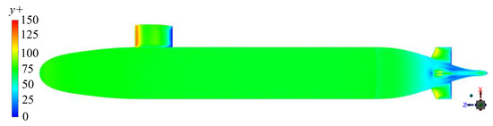 Due to the significant impact of wall boundary layer resolution accuracy on the drag of the suboff, the dimensionless distance y+ of the first mesh layer on most regions of the suboff surface was maintained at around 60 in the calculations. The overall y+ distribution of the suboff is shown in Figure 5. This meets the criterion proposed by Menter [37], which suggests that a y+ value below 300 is sufficient to achieve acceptable predictive accuracy in simulations of industrial flows. Besides the boundary layer, the global mesh density also significantly affects the calculated drag value of the suboff, and the effect of the total mesh number on drag was studied. The drag value at a similar speed (17.79 knots) to this study, provided by Liu [38], was used as a reference. The calculations used the same boundary conditions and computational domain as shown in Section 2.2.2, with the difference being the removal of the dual-stage PJP. As shown in Table 3, the calculated drag values approached the reference value as the mesh number increased, with overall deviations remaining small, indicating the reliability of the calculated values. Therefore, to balance computational accuracy and cost, the mesh size equivalent to Mesh 2, with a total of 7.45 million cells, was selected for subsequent calculations and analyses.