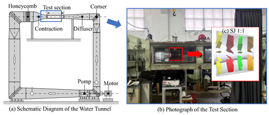 The verification of the steady-state hydrodynamic performance of the propulsor was primarily achieved by comparing the experimental results with numerical simulation results to validate the accuracy of the numerical simulation. First, model tests were conducted in a large cavitation tunnel, measuring key parameters such as thrust, torque, and the efficiency of the propulsor under different operating conditions. These experimental data provide reliable reference standards for numerical simulations. By comparing and analyzing the experimental results with the numerical simulation results, the accuracy and reliability of the numerical simulations were assessed. This method can effectively verify the accuracy of the numerical simulations, ensuring that they accurately reflect the hydrodynamic performance of the propulsor under actual operating conditions, thereby providing a scientific basis for subsequent internal flow field analysis and the design optimization of the propulsor. The experiments in this study were conducted in the large cavitation tunnel at the Shanghai Ship and Shipping Research Institute, as shown in Figure 6a. The dual-stage PJP used in the experiments is presented in Figure 6b. The tunnel flow speed was continuously adjustable within the range of 3~12 m/s. The flow speed in the working section was measured by a Venturi flowmeter, with an uncertainty of 0.5% FS (full scale). The rotational speed, thrust, and torque of the dual-stage PJP rotor were synchronously measured by a J25 dynamometer, with ranges of 0~4000 rpm, 0~3 kN, and 0~150 Nm, respectively, and an uncertainty of 0.1% FS. The thrust of the stator and duct was measured by a five-component force balance, with a range of 0~400 N and an uncertainty of 0.01%.