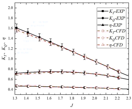 Both the experiments and simulations adjusted the advance coefficient by fixing the rotor speed and varying the inflow velocity. The comparison between the experimental and simulation results is shown in the figure, with the dimensionless parameters defined in the equations.