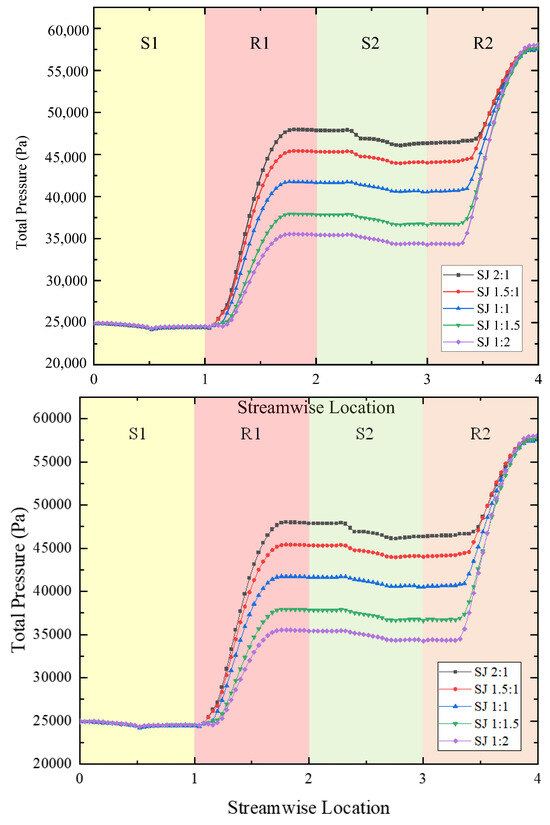 Figure 8 shows the total pressure variation along the flow direction for each component of the propulsor under different load distribution ratios. This further visually demonstrates the energy growth distribution of each component. It can be observed that the overall working capacity of the five propulsors is relatively consistent, which corresponds with the total rotor head results in Table 5. However, the working capacity of the first-stage and second-stage rotors varies. The energy growth pattern also aligns with the design expectations: as the loads are aft-shifted, the working capacity of the first-stage rotor gradually decreases while that of the second-stage rotor gradually increases.