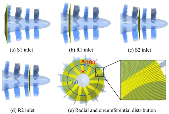 The energy conversion of the propulsor is primarily driven by the rotation of the rotors. Due to differences in the actual flow field, the flow velocity can vary significantly, and the inflow conditions directly affect the load distribution on the rotor blades, thereby influencing the excitation force. The statistical analysis of the spatial distribution of the flow field in front of each propulsor component was conducted. The axial positions of the monitoring planes were set at the inlets of each component stage, with the four component sections named P1, P2, P3, and P4, respectively. Radially, 97 points were evenly distributed from span 0.02 to span 0.98 at intervals of span 0.01. Circumferentially, 360 points were evenly distributed from 1° to 360° at intervals of 1°. Therefore, each section contained a total of 34,920 points. The axial velocities at each section were extracted and analyzed. The layout of the monitoring planes and the positions of the monitoring points are shown in Figure 9.