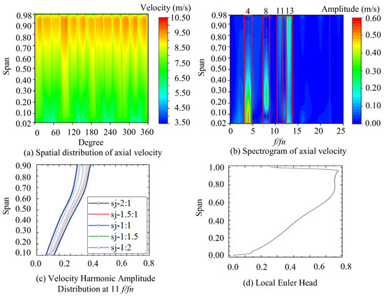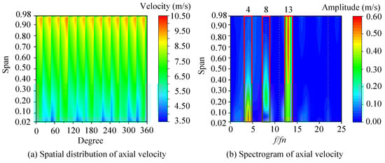 As the flow progresses downstream, the axial velocity in front of the first-stage rotor shows an overall increase compared to that in front of the first-stage stator. This increase is mainly due to the work performed by the first-stage rotor, which reduces the low-speed region near the hub and expands the high-speed region at larger radii. In the axial velocity spectrum (Figure 11), it is evident that besides the pronounced pulsations at the 4th, 8th, and 13th harmonic components—similar to those in front of the first-stage stator—an 11th harmonic component also emerges in front of the first-stage rotor. This corresponds to the interference effect caused by the rotor blade count. These observations suggest that, as the flow develops downstream, the influence of the rotor on the axial velocity of the fluid progressively increases, whereas the stator’s influence diminishes. Notably, the influence of the fourth and eighth harmonic components is consistently concentrated below span 0.5, indicating a strong correlation with the low-radius region throughout the flow development.