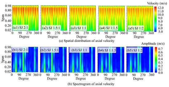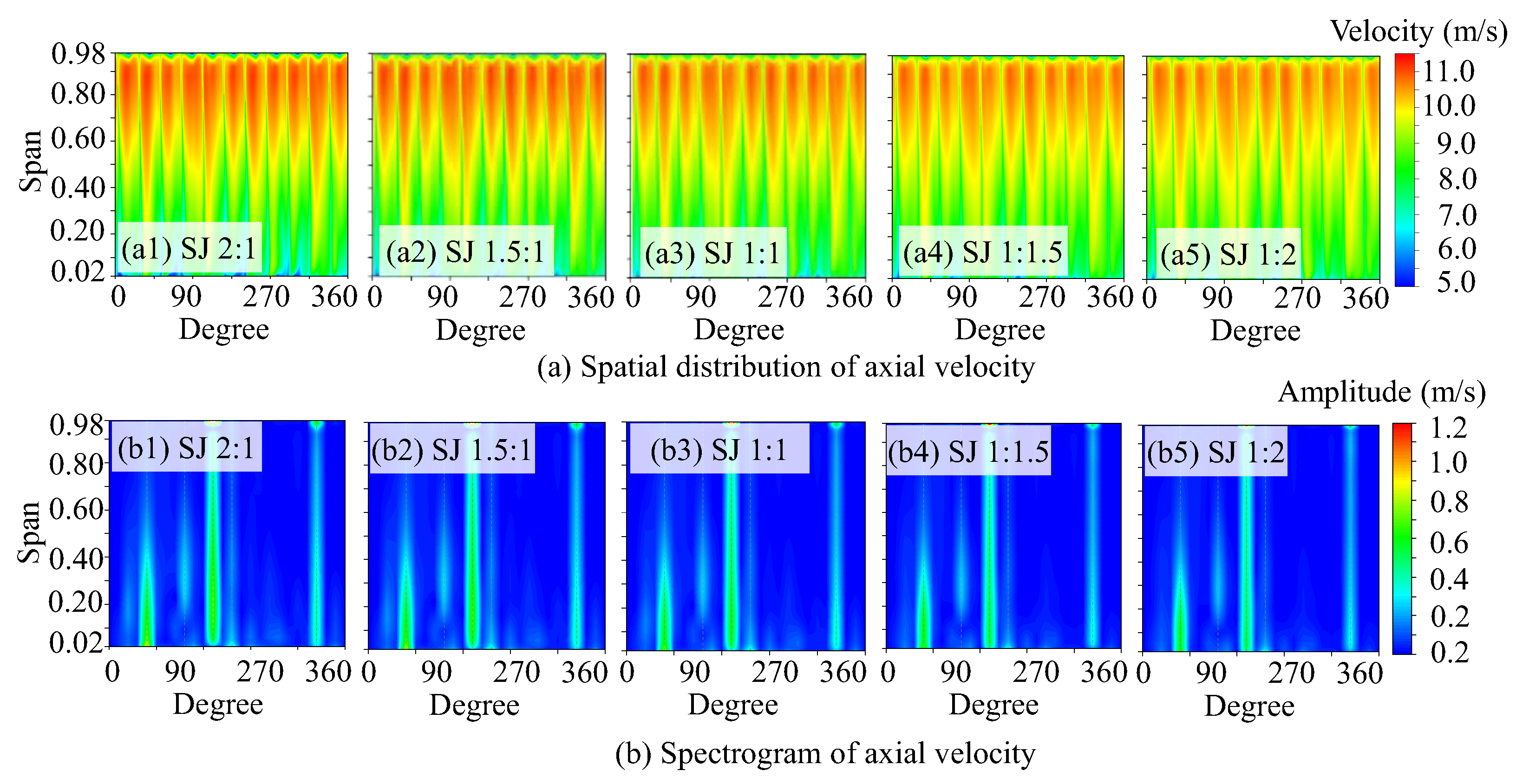 As the flow progresses downstream, the axial velocity distribution and its corresponding spectrum in front of the second-stage stator are depicted in Figure 12. Following the energy transfer from the first-stage rotor, the overall axial velocity in front of the second-stage stator further increases, and the flow non-uniformity also intensifies. It can be observed that as the load distribution ratio is gradually aft-shifted, the low-speed region at lower radii progressively diminishes, while the high-speed region at higher radii also decreases, resulting in a more uniform overall velocity distribution. This pattern, primarily shaped by the cumulative influence of upstream components, aligns with the design intention across the five models to ensure the load is aft-shifted. Consequently, the work performed by the first-stage rotor gradually decreases while the second-stage rotor’s workload increases, leading to a progressively more uniform flow field. From the axial velocity spectrum, it is evident that compared to the area in front of the first-stage rotor, the most notable change is the significant reduction in the 13th harmonic component associated with the stator blade count. Conversely, the BPFVHC corresponding to the rotor blade count and its multiples significantly increase, mainly due to the stronger influence of the rotor on the fluid as it approaches the rotor. As a result, the BPFVHC becomes the dominant factor in the flow field. Furthermore, at lower radii, the fourth harmonic component and its multiples, related to the rudder count, continue to exert a considerable influence.
