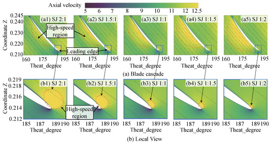 Axial velocity distribution of the two-stage PJP: (a) span 0.2; (b) span 0.5; and (c) span 0.8.