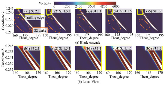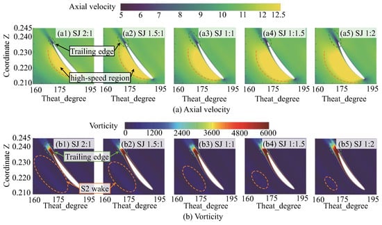 Figure 18 presents the vorticity distribution characteristics on the span 0.8 cylindrical surface of the second-stage rotor under different load distribution ratios. The results indicate that high vorticity is primarily concentrated near the blade’s trailing edge, and as the load distribution ratio is aft-shifted, the vorticity intensity near the trailing edge shows a significant decreasing trend. A combined analysis with the velocity field distribution reveals that the range of the low-speed region near the trailing edge shrinks correspondingly, further highlighting the strong coupling relationship between local vorticity intensity and velocity distribution. Further analysis shows that in the SJ 2:1 model, a high-vorticity region nearly parallel to the blade appears in the flow passage, primarily caused by the extension and superposition of the second-stage stator wake effect into the rotor flow field. In contrast, for the SJ 1:2 model, the vorticity intensity at the same location significantly weakens, and the velocity field distribution shows that the low-speed region in this area almost completely disappears. This phenomenon primarily results from the aft shift in the load distribution, which increases the workload of the second-stage rotor, expands the high-speed region on the suction surface, and effectively covers and weakens the low-speed region induced by the stator wake. This finding demonstrates that aft-shifting the load distribution can significantly weaken the disturbance caused by the stator wake effect on the rotor flow field, improve the flow uniformity in the rotor region, and thereby optimize the flow field of the second-stage rotor.