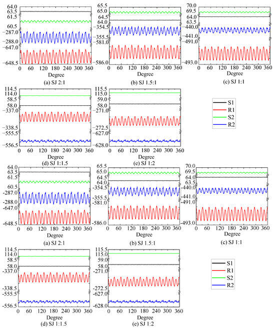 As shown in Table 4, the time step significantly affects the axial excitation force of each rotor, with the axial force of the second-stage rotor being more sensitive to changes in the time step. The results calculated with 2 deg per step time step clearly underestimate the amplitude of the axial excitation force. Although there is still some discrepancy between the results of 1 deg and 0.5 deg, considering the computational cost, this study selected a 1 deg per step time step for subsequent calculations. This choice, although sacrificing some accuracy in the axial excitation force calculation, represents a good balance between computational economy and accuracy.