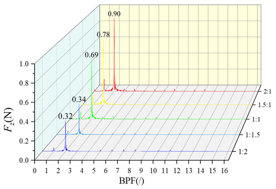 It can be observed that the primary reason for the reduction in the unsteady axial force of the propulsor as the load distribution ratio is aft-shifted is the simultaneous reduction in the unsteady forces of both the first- and second-stage rotors. However, it is generally expected that as the axial force of the rotor increases, the unsteady force also increases. In contrast, in the dual-stage PJPs, as the axial force of the second-stage rotor gradually increases, its unsteady axial force exhibits the opposite trend. The magnitude of the rotor’s unsteady force has been found to be closely related to its upstream flow field [39]. Therefore, by comparing the impact of load distribution changes on the flow field in Section 3.2, it can be concluded that aft-shifting the load distribution significantly reduces the BPFVHC in front of the second-stage rotor, leading to a more uniform flow field and markedly improved the inflow conditions at the front of the second-stage rotor. As a result, even though the aft shift in the load increases the absolute axial force of the second-stage rotor, its unsteady axial force continues to decrease. Therefore, in designing dual-stage PJPs, the load can be appropriately aft-shifted, allowing the second-stage rotor to bear more load and thus achieving low noise and low vibration design objectives. Additionally, this indicates that, given the consistent overall working capacity, the results of steady velocity distribution, particularly the BPFVHC, can predict the axial unsteady force. This lays a foundation for the rapid prediction of unsteady performance in future propulsors or axial flow fluid machinery design.