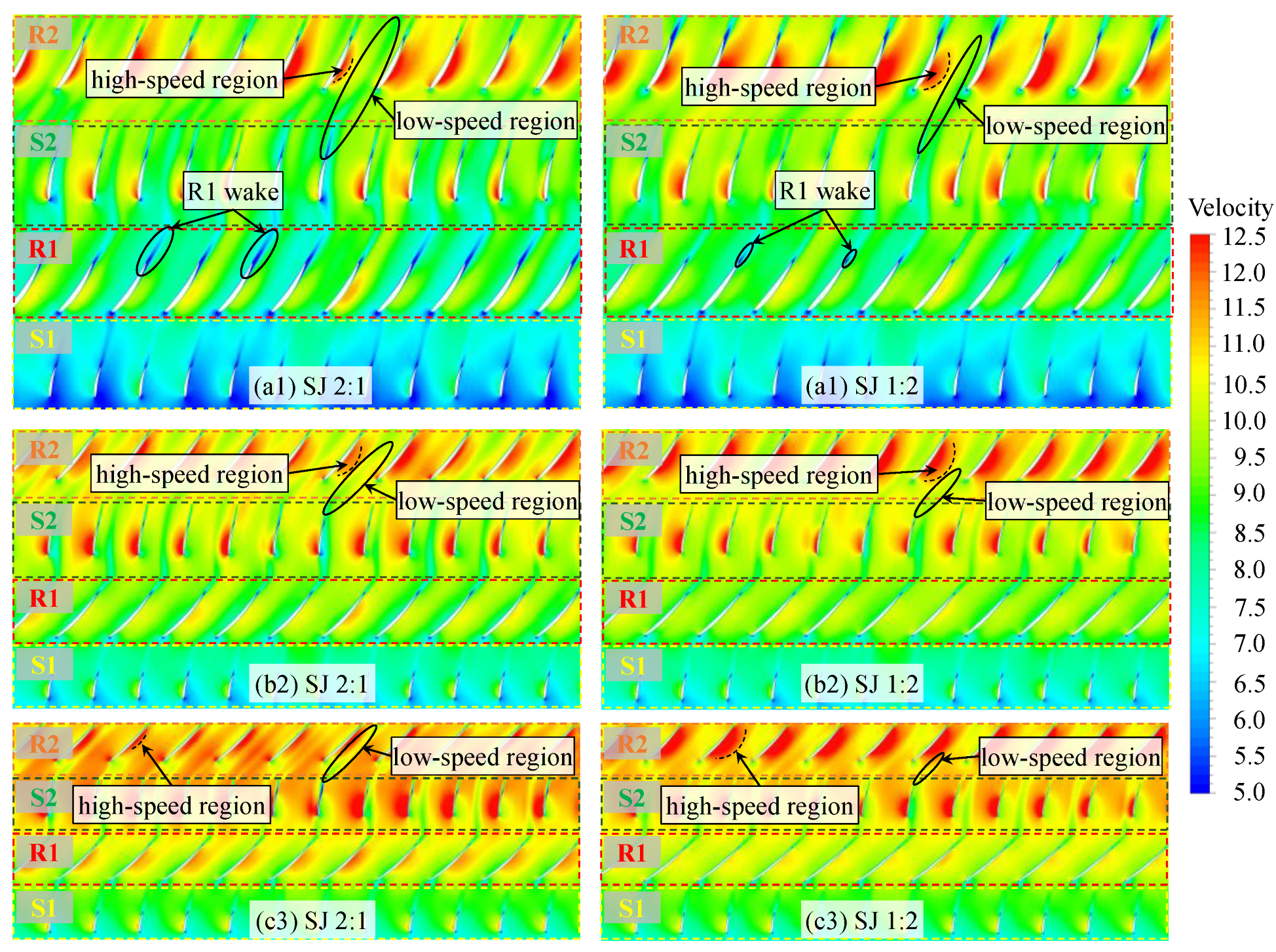 Figure 16 shows the axial velocity distribution at spans 0.2, 0.5, and 0.8 for the 1:2 and 2:1 load distribution ratio. Axial velocity generally increases along the flow direction through S1, R1, S2, and R2, reflecting the continuous energy transfer undertaken by both rotors. All models exhibit periodic flow patterns, indicating effective modulation by stators and rotors. Under the 2:1 ratio, a pronounced low-speed wake appears between R1 and S2 due to stronger rotor work and blade geometry near the hub. In contrast, the 1:2 model, with weaker R1 work and smaller exit angles, shows a more uniform flow near S2. In the R2 region, the 2:1 model’s rotor lacks sufficient load to overcome S2’s wake, while the 1:2 model enhances R2’s performance by expanding the high-speed suction region and improving flow uniformity. At span 0.5, the rotor outlet angle decreases, weakening flow separation and low-speed wakes. Despite some residual interference from upstream wakes, the 2:1 model’s stronger R2 effectively suppresses S2’s wake, improving downstream uniformity. At span 0.8, closer to the tip, overall velocity increases. Low-speed wakes persist, but the expanded suction-side high-speed zone in the 1:2 model more effectively suppresses S2’s wake than at lower spans. This highlights the significant benefit of rearward load redistribution, especially in tip regions.