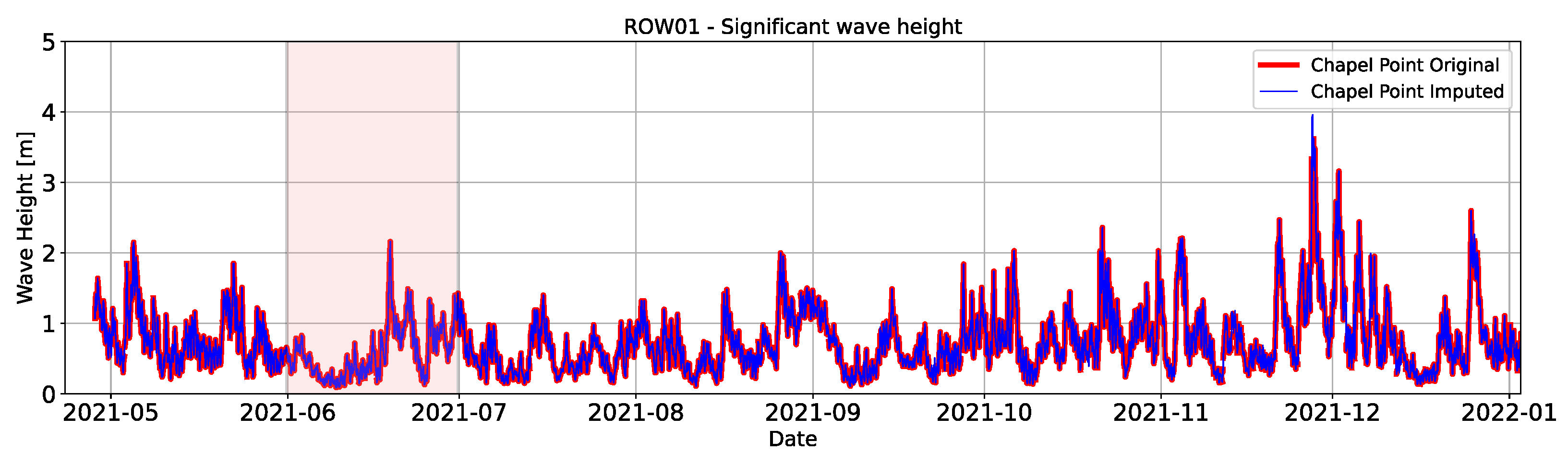 A preliminary performance assessment is addressed, considering the artificial removal of a month of data from one of the buoys for the ROW01 site. Those missing observations are then imputed following the kNN-based strategy described in the previous section. In particular, the month of June is removed from the Chapel Point buoy (highlighted by the shaded area in