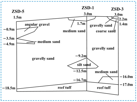 The study area is an island in the South China Sea, situated at 16°59′ N latitude and 112°16′ E longitude, with its geographical location depicted in Figure 1. This island belongs to China and is located in the northwestern waters of the South China Sea; it is a typical instance of expanding land area through blowing and filling on a natural reef. After blowing and filling, it has a land area of approximately 0.29 square kilometers and a vegetation coverage of around 60%. The island’s coast is divided into the primary coast and the later blown-in artificial coast. The primary coast is distributed in the northeast, east, and southeast of the island, while the later blown-in coast is distributed in the northwest, west, and southwest. The later blown-in coast is equipped with wave-protection dykes and stones thrown outside the dyke. The wave protection dyke comprises two types, i.e., dry-laid blocks and mortar-laid blocks, and the slope of the dyke surface ranges from 50 to 60 degrees. Geological boreholes, namely, ZSD-1, ZSD-3, and ZSD-5, were drilled on the island’s center, inner coast, and outer coast, respectively. When these boreholes were drilled to a certain depth within the reef tuff layer, the depth was taken as the ultimate standard. Based on the drilling data, the stratigraphic generalization model of the island, as presented in Figure 2, reveals that the underground water-bearing medium of the island has a binary structure, that is, a coral sand layer and a reef tuff layer. In the coral sand layer, the majority consists of gravelly sand, with a small amount of silt, medium sand, coarse sand, and angular gravel distributed locally. The interface between the coral sand layer and the reef tuff layer is an unconformable interface existing 16.7 to 18.5 m below the ground surface, so the numerical simulation part of this paper also adopts this binary aquifer structure. According to an on-site water quality survey, the salinity and conductivity of the nearshore seawater of the island are relatively stable and only fluctuate within a narrow range, with the salinity varying within the range of 35.5 to 36 and the conductivity varying within the range of 54,000 to 54,750 microsiemens/cm. The overall salinity of the seawater in the waters surrounding the coral islands and reefs, both nearshore and offshore, does not change significantly. However, the concentration of chloride ions in the seawater slightly increases as it moves away from the islands and reefs.