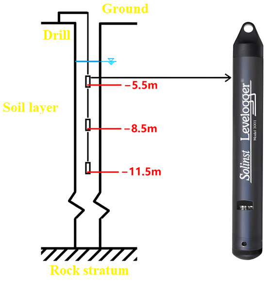 To ensure the principle of ecological and environmental protection of the island, large-scale geological exploration work on the island should be avoided as much as possible. Therefore, in line with the principle of fewer holes, while still revealing the hydrogeological conditions of the island as much as possible, three hydrological monitoring wells were installed at the locations of the previous geological boreholes. To prevent the borehole walls from collapsing and being clogged by fine particles, a 90 mm diameter PVC perforated pipe with a 3 mm diameter hole was placed in the boreholes. There was a series of holes on the pipe wall with a 10 cm interval between the vertical holes. Additionally, a layer of geotextile was wrapped around the PVC pipe to ensure that the groundwater in the borehole could exchange with the surrounding groundwater and that excessive fine soil particles would not enter the borehole, which could lead to clogging. After the groundwater in the boreholes had rested sufficiently, observation sensors were placed at depths of 5.5 m, 8.5 m, and 11.5 m in the three hydrological monitoring wells to record groundwater information throughout the day. Sensors were also placed in the island’s tide station to record tidal data. The frequency of equipment calibration and external data recovery was once a quarter, and professional engineers were responsible for removing anomalies by comparing and analyzing the data collected at each monitoring site. The remaining data were taken as the site’s final monitoring data. The water quality monitoring sensor employed the LTC Levelogger three-parameter groundwater logger manufactured by the Canadian company Solinst. This sensor has a built-in microcomputer and battery and can automatically record groundwater level, conductivity, and temperature data offline. The data collection interval of the water quality monitor is 5 min, a 24 h day, and the maximum operating time is 8 years. A schematic diagram of the sensors and their arrangement is shown in Figure 3. The authors installed a small weather station on the island to obtain meteorological data synchronized with the water quality monitoring data. The weather station system encompasses a data collector, an air temperature and humidity sensor, a wind speed and direction sensor, a photosynthetically active radiation sensor, a total radiation sensor, a precipitation sensor, a soil three-parameter sensor, and a soil heat flux sensor. The weather station collected data every 15 min, and the observation period was from January to December 2018.